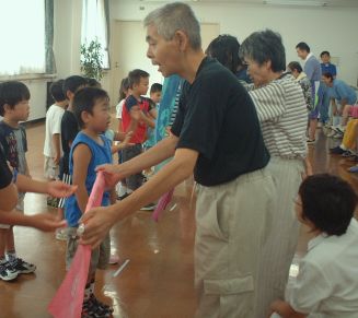 | 飯能リハビリ館 ディサービスなので人数も少なく、3箇所目、子供たちもちょっとリラックス。 自分たちで作った、手染めののれん、自慢げにプレゼントしています。 褒めてもらってうれしそう・・・ |