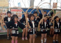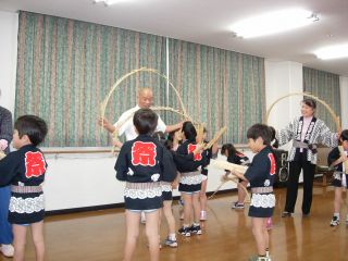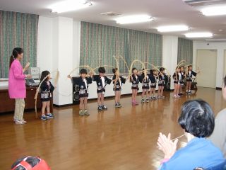 | ぞう組が玉すだれで老人ホームを訪問しました。 みんな上手でした。挑戦した職員さん、なかなかできなくて子供たちが教えていました。2005.1.6 |