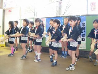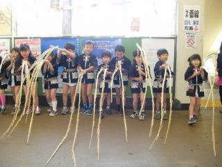 | 青梅線の河辺駅で玉すだれ。 大道芸です、みんな足を止めて、手拍子で応援してくださいました。 |