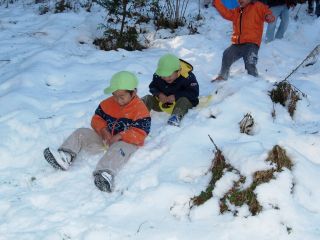 | そりを持って、保育園の対岸の山へ。 みんな、キャーキャー大騒ぎ 2005.1.5 |