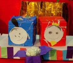 牛乳パックに折り紙と千代紙を貼って、ひな人形を作りました。 台はティシュペーパーの箱でできています。 |