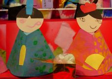 | ぞう組は工作紙に和紙をつけて巻き、マジックで書いた顔を、のりで付けた後、首元を輪ゴムで止めました。 冠、扇子などは折り紙、画用紙を使い、雛人形の一番下は、雛段はイメージしていろいろな折り紙を使って 自由に作りました。 小さいクラスの時から、卒園までの数年間でつくったお雛様、 保育園で作った全部のお雛様を大切にとっておいて、家で並べてみてくださいね。 |