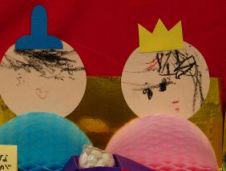 | うさぎ組のお雛様 ゼリーカップに画用紙で作った顔を付け、 コーヒーフィルターに絵の具で色を塗り、綿棒を使って模様をつけた着物を着せました。 |