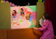 | さっきまでの緊張もほぐれて楽しいお別れ会です。先生たちの大型紙芝居。大笑いでした。 |