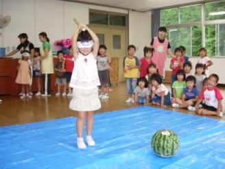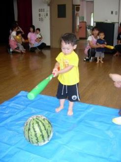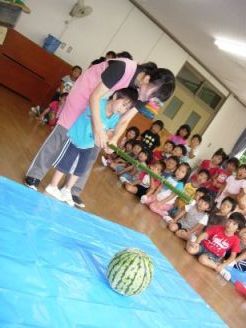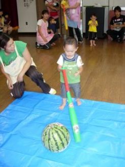竹を持って、お友達の大声援の中、、右かな? 左かな?