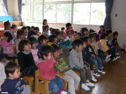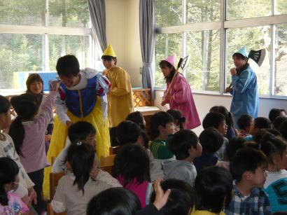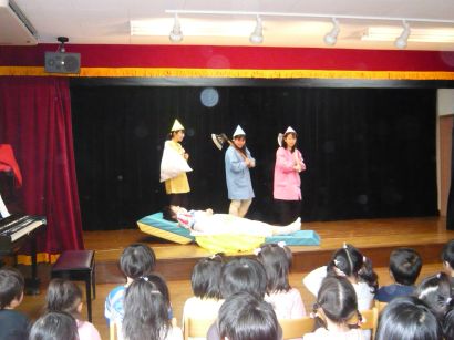 | 先生たちの熱演に、子どもたちは笑ったり、心配したり・・・・いつもと違う先生に大喜びでした。 |