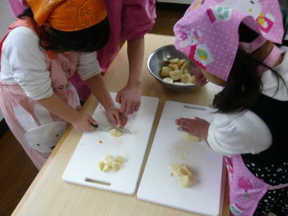 野菜を切って、園庭で煮る予定になっていましたが、雨が降りそう・・・