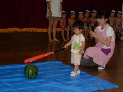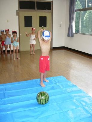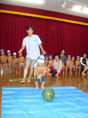 保育園ではプール納めに恒例のスイカ割りをしました。