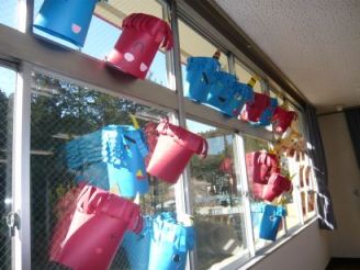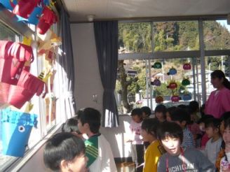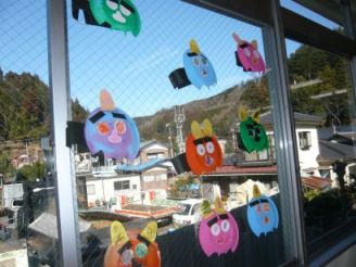 子どもたちが作ったお面が、ホールの窓につけられました。