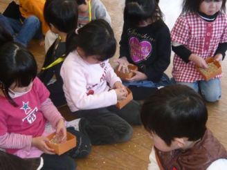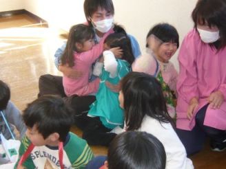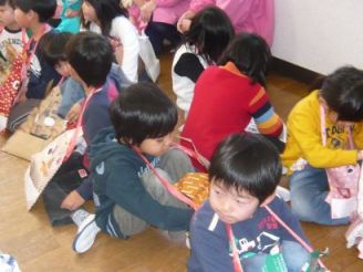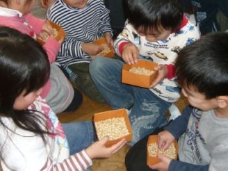ホールにみんなで集まって、豆まきのお話を聞きました。