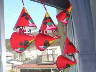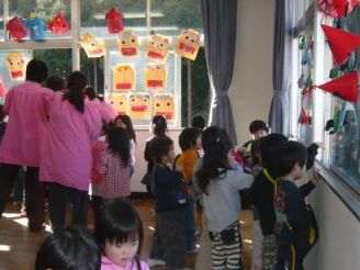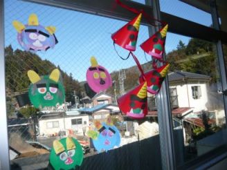 | さあ、いよいよ、、、窓をあけて、自分の作ったお面に向けて。鬼は----外。 |