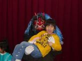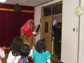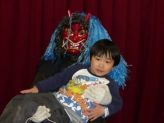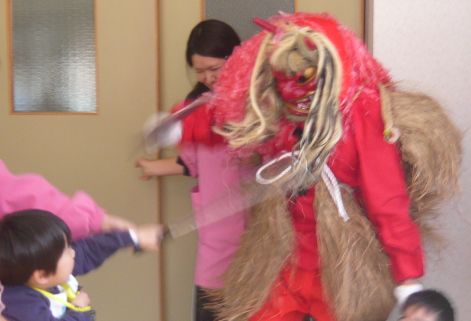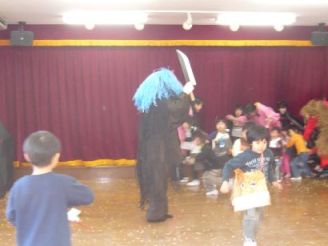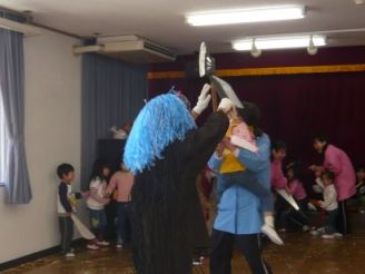 S先生だけ、、、、応援の子どもたちはどこに?? 早く、みんなで鬼をやっつけようよ。 ヤダー、僕ヤダー。。。