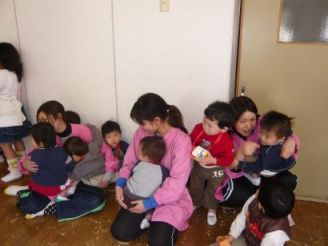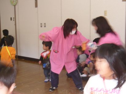 先生から豆をもらってもなんか、神妙な顔。 すでに男性保育士のS先生にしがみついて。