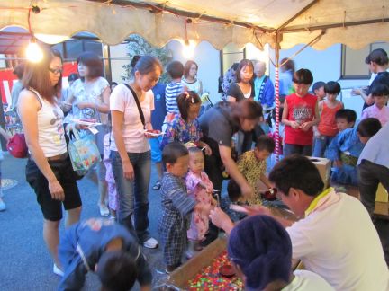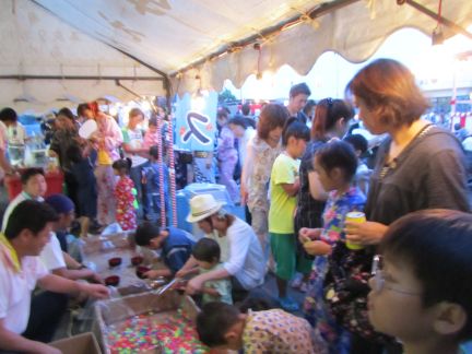 | 踊り終わるころ、あたりは暗くなり、 ホームで用意してくださった、金魚すくい、スーパーボール 焼きそば、やきとり、ところてん、チョコバナナ、カキ氷、フランクフルトなどなど数種類。 食べ過ぎないようにお楽しみ券引き換えで、いただきました。 |