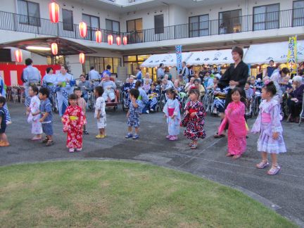 | 22年7月24日 今年も、可愛い浴衣を着て、あゆみえんに集まりました。 毎年、あゆみえんのご好意で、子供たちが盆踊りを体験できます。 |