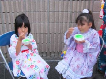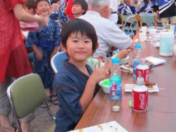踊りが終わると、たくさん食べて遊んで行ってくださいのお話をいただき、大喜びでした。