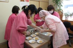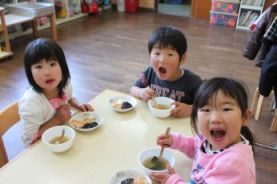 搗けたお餅を、先生たちで、きなこをつけたり、ゴマ大根おろしをつけたり。 |