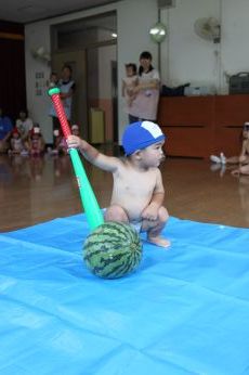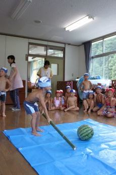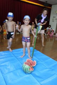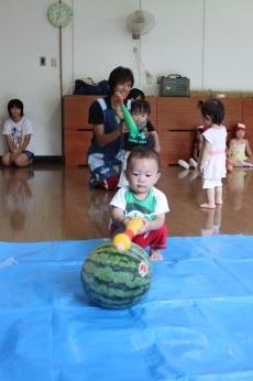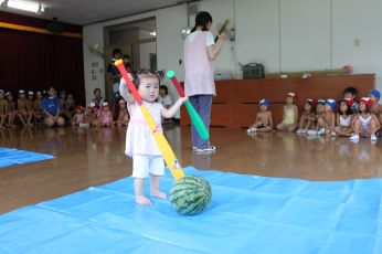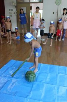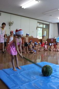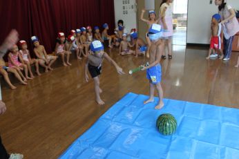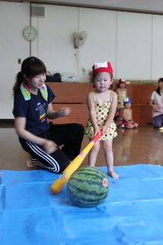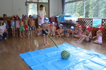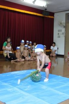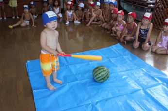 | 今日はプール納め ホールですいか割を楽しみました。 小さいお友達は、かわいいバットでコーン・・・ |
