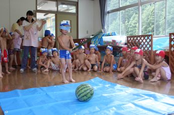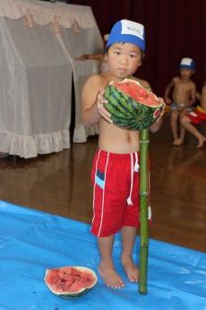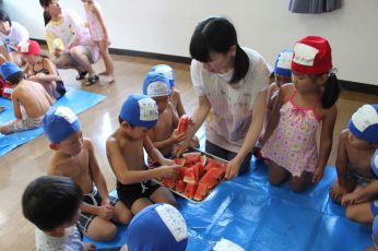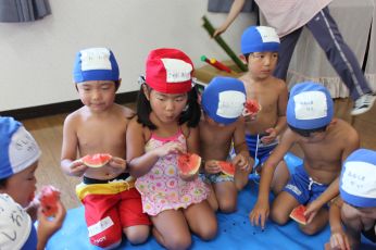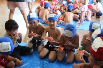 | みんなで食べるスイカは、とってもおいしかったです。 この後、最後のプール遊びを楽しみました。 |